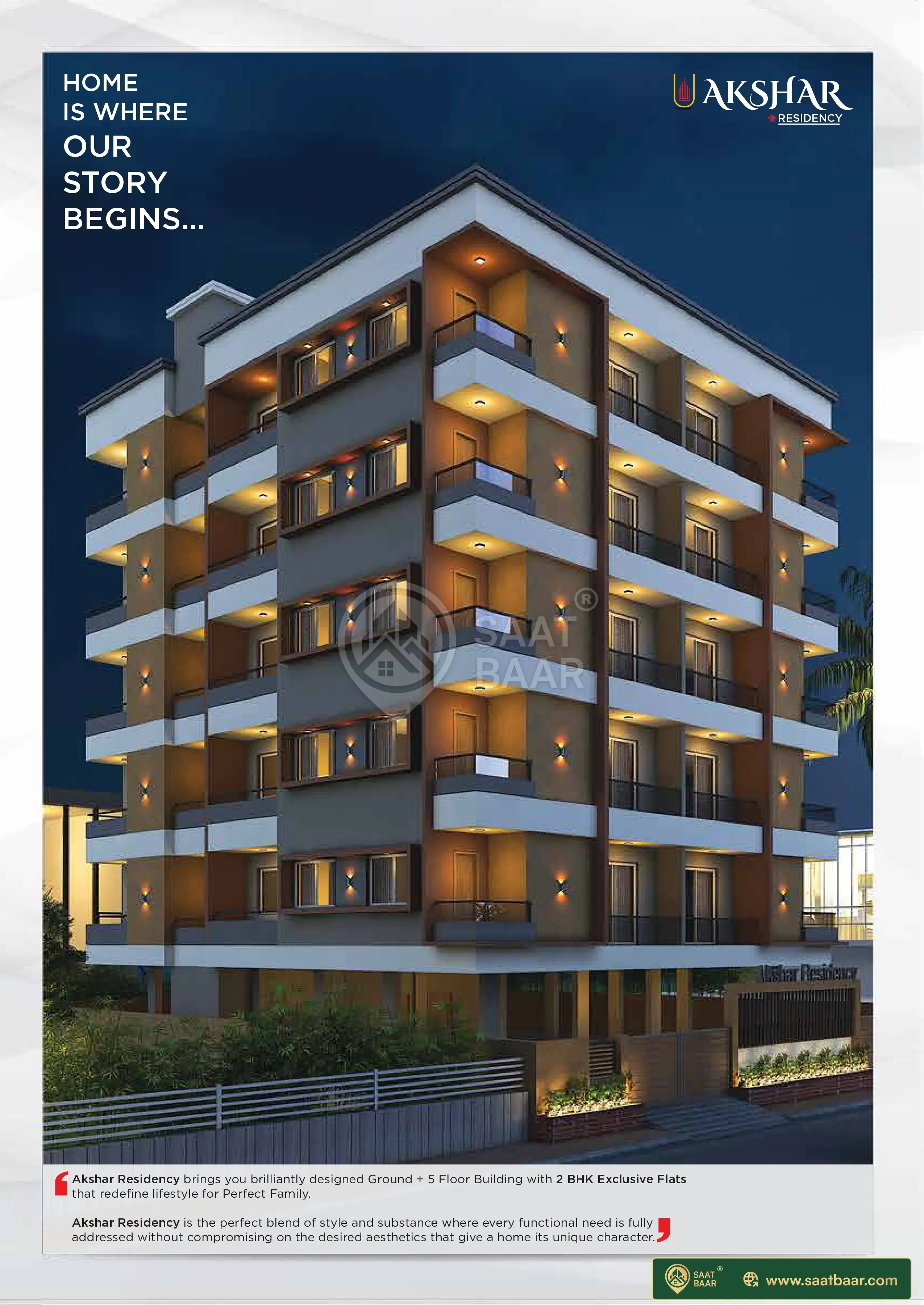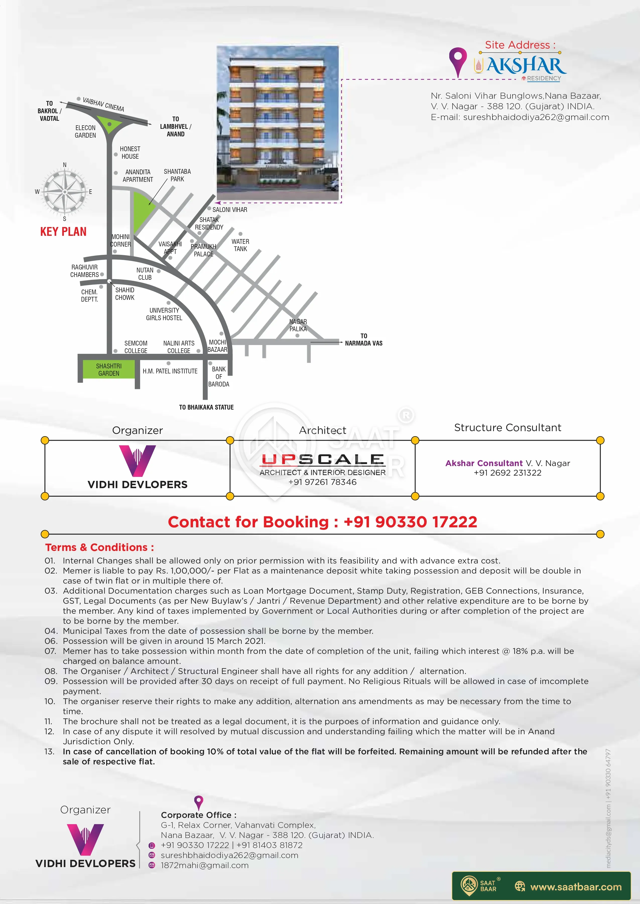 Akshar Residency is a premium residential project launched by Vidhi Developers Anand. It is located in V V Nagar, Anand. The project will be developed on an area of 0.1 acres and is offering 1 and 2 BHK apartments for sale. Carpet area of 1 BHK apartments is 456 sq ft. and for 2 BHK apartments it is 543 sq ft. Facilities like car parking area, lifts, stormwater drains, regular supply of water and other amenities needed for a comfortable living are available in the complex. CCTV cameras will be installed in the complex for the safety and security of the residents. Specifications included in the apartments are vitrified tiles flooring in living room, bedrooms, kitchen and bathrooms, Kota stone in balconies, glazed tiles dado up to lintel level on kitchen walls, designer tiles dado up to 7 feet height above platform on bathrooms walls, sand faced plaster on exterior walls. Anchor or Roma switches, ISI marked copper wiring in concealed PVC conduits, two track UPVC sliding windows with mosquito mesh shutters, granite platform with stainless steel sink in the kitchen, CP fittings of Jaquar or Marc or equivalent quality, a decorative door at the entrance, and earthquake resistant RCC frame structure as per seismic zone. V V Nagar or Vallabh Vidyanagar is an educational hub in Anand. Schools, educational institutes, hospitals, and other utility shops are located in the vicinity. It is a comfortable area to own a residential place.
