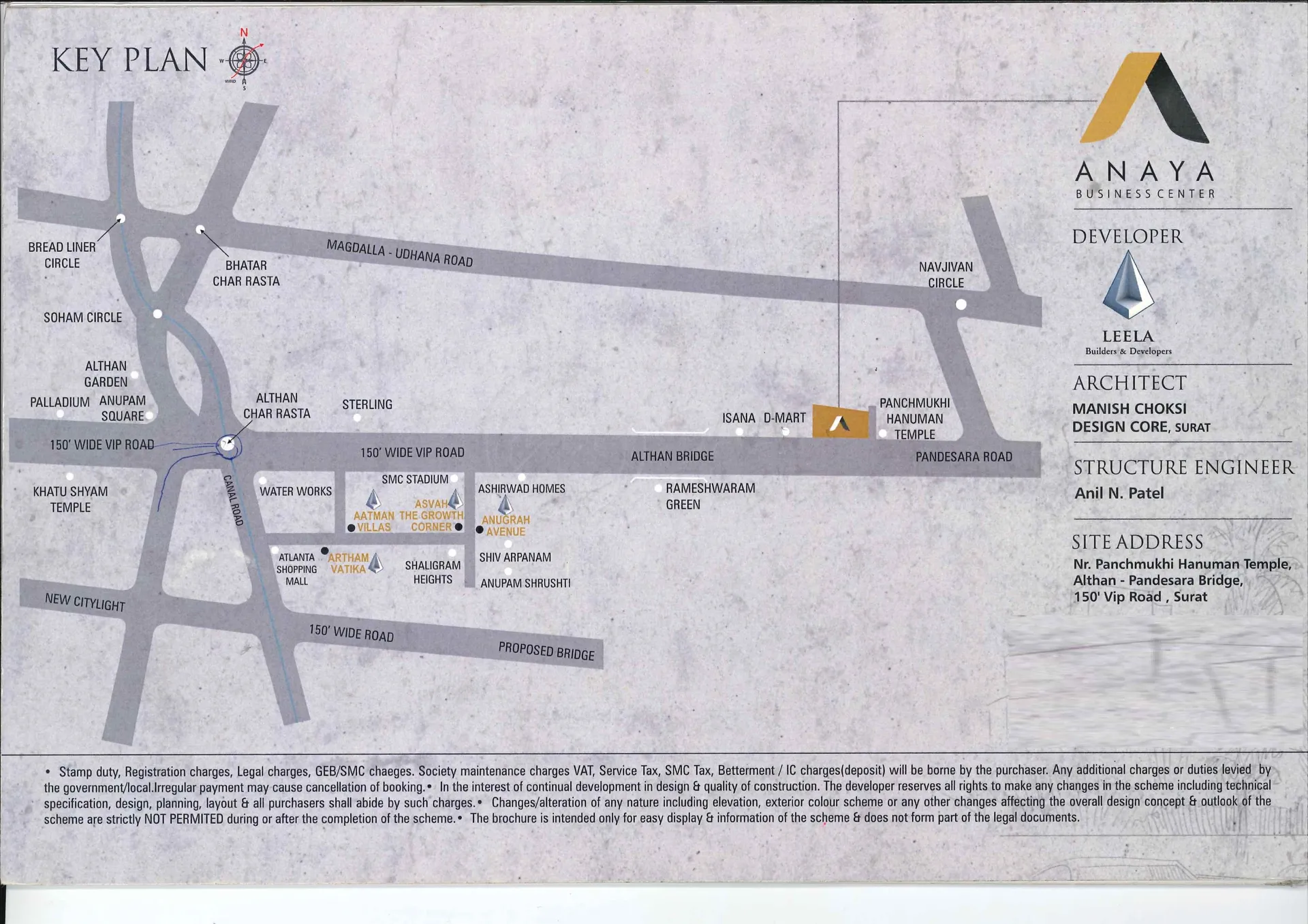 The complete address of the site is Canal Rd, Beside D-Mart, Althan, Surat, Gujarat. This project comes under the pincode of 395017. Anaya Business Center is where fine living meets seamless connectivity to provide you comfort living.