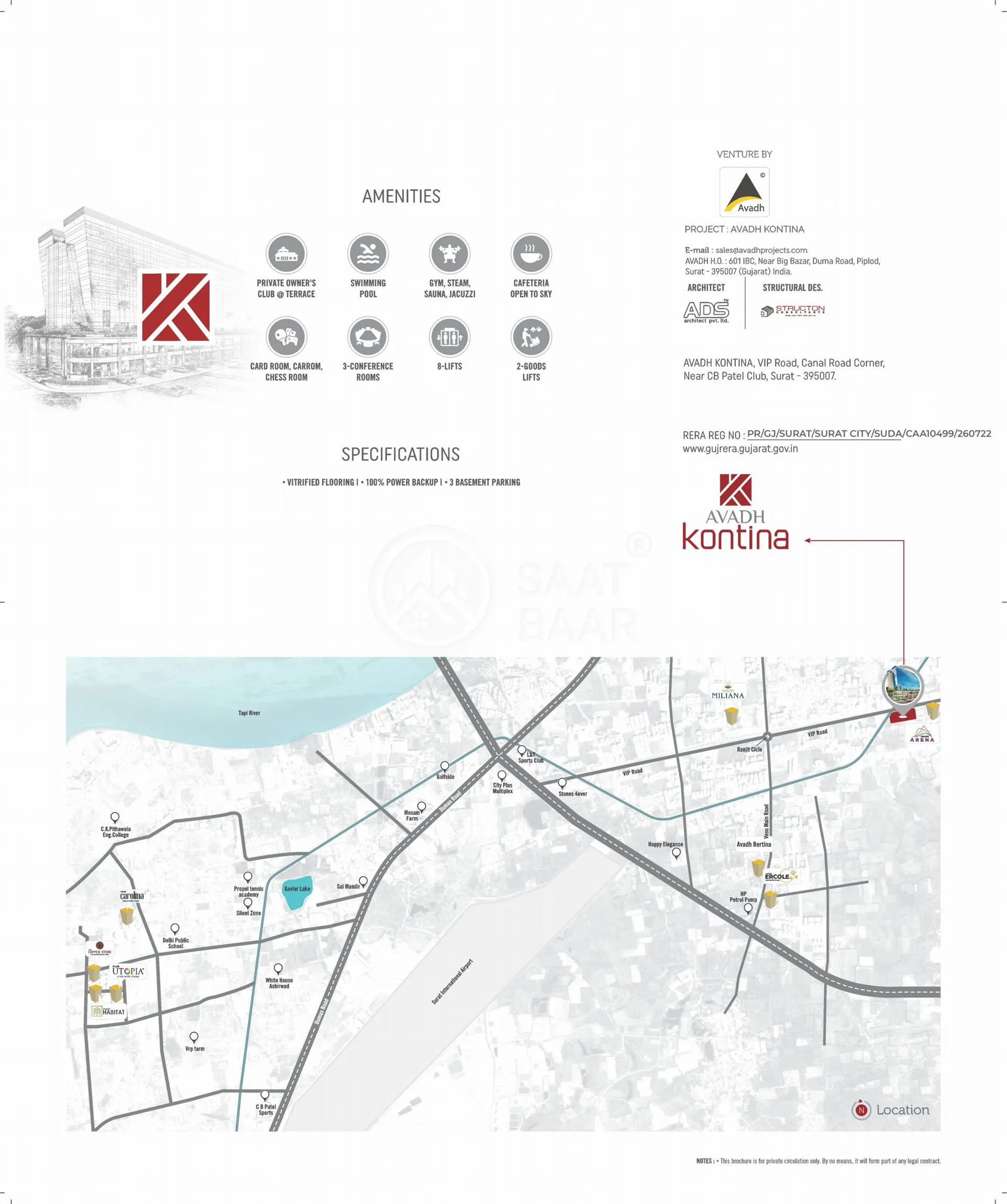 Avadh Kontina Surat is spread over 2.2 acres and have 378 units to offer. The properties in Avadh Kontina are available in numerous configurations. Avadh Kontina Bare shell Office Space are available in 398 sq.ft. whereas Shop are available in 1,534 sq.ft. The project has vast dimensions and has single tower here.
