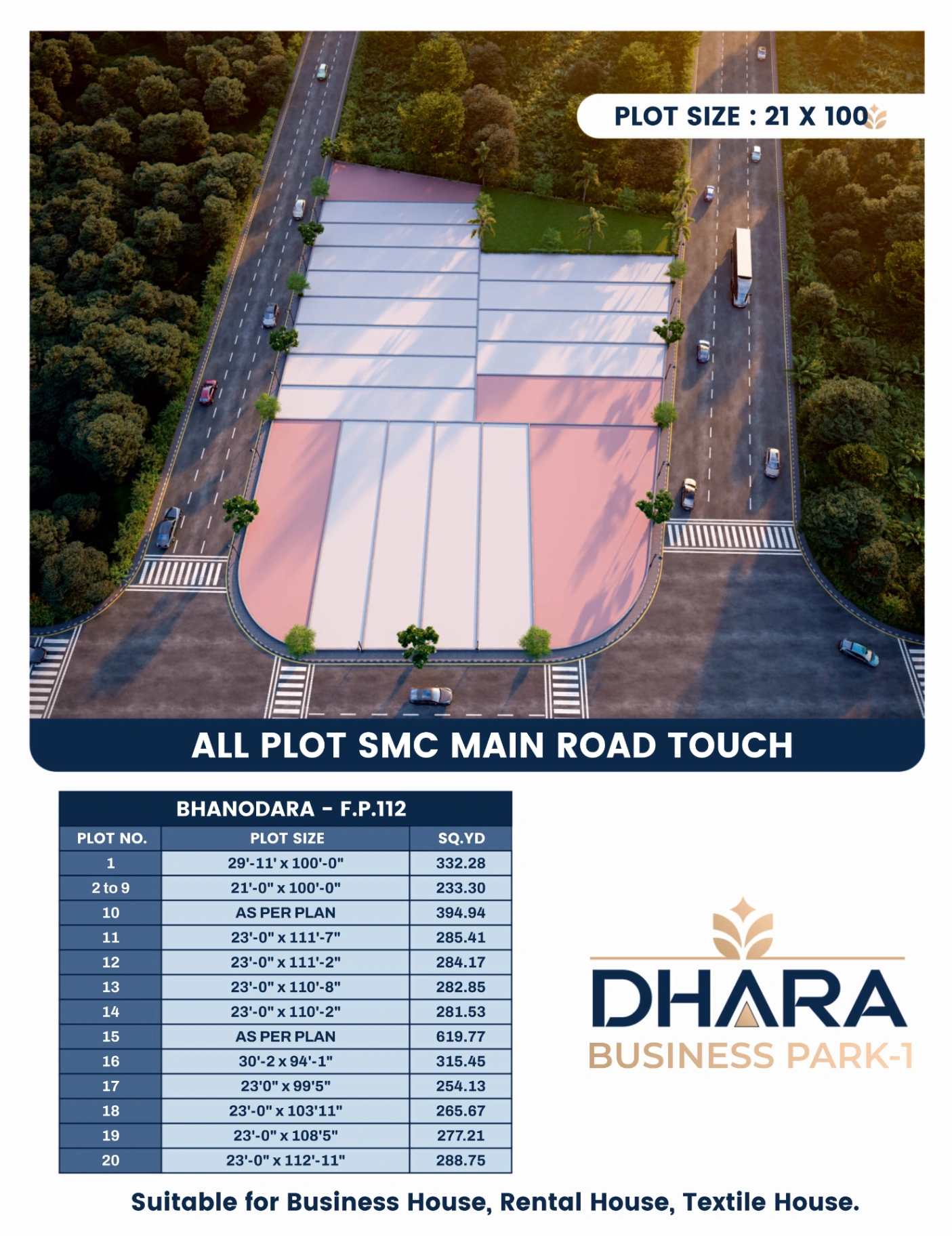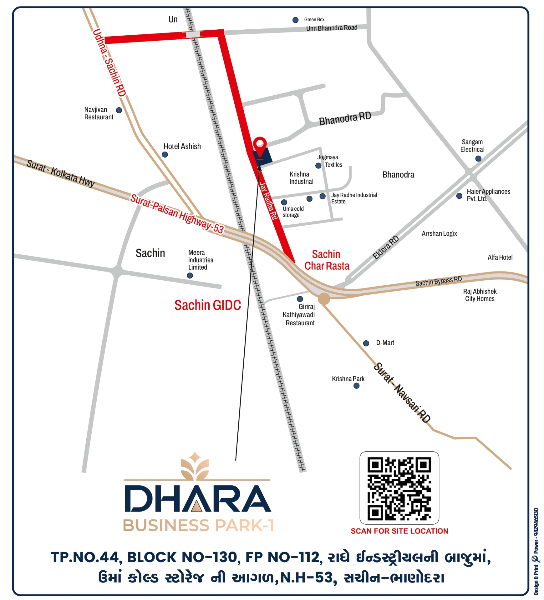 ધારા બિઝનેસ પાર્ક સચિન-ભાનોદરા ના ઝડપી વિકસતા ઇન્ડસ્ટ્રિયલ ઝોનમાં આવેલ પ્રીમિયમ ઇન્ડસ્ટ્રીઅલ ઓપન પ્લોટ છે. મેન્યુફેક્ચરિંગ યુનિટ, અને કોઈપણ પ્રકારના ઇન્ડસ્ટ્રિયલ સ્ટાર્ટઅપ માટે આ લોકેશન સંપૂર્ણ રીતે સુલભ છે.