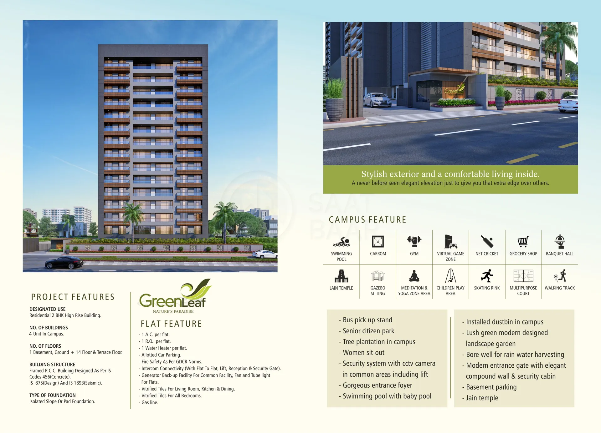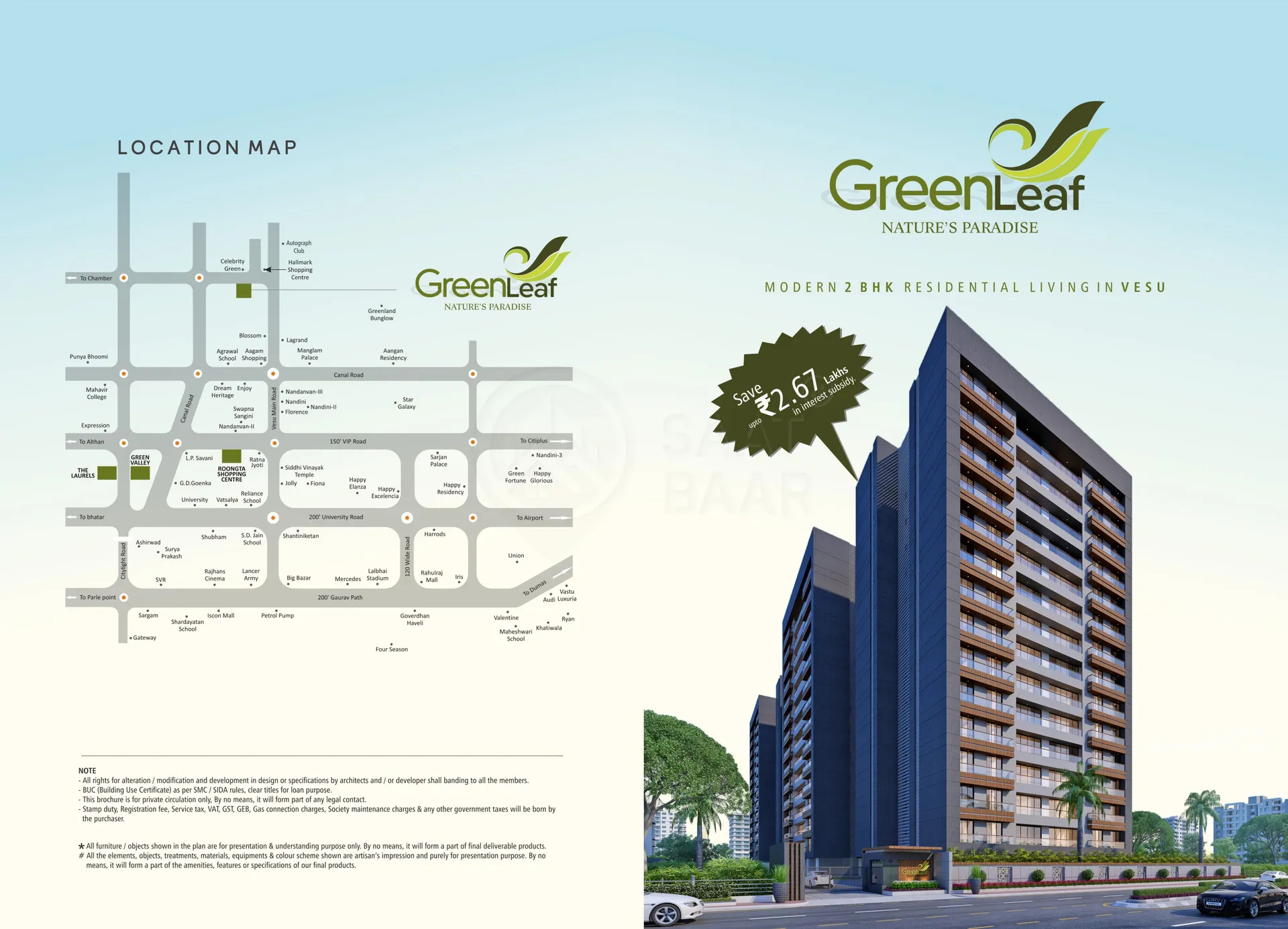 Green Leaf is one of the latest real estate residential project developed by the Roongta Devlopers in the Vesu area of Surat. The developers have designed it thoughtfully. The raw materials, fittings, and fixtures used to create this residential project are of the best quality. The total area of land on which the project is developed is 1.75 acres. The developers are ready to offer spacious apartments to the residents with all the necessary amenities.