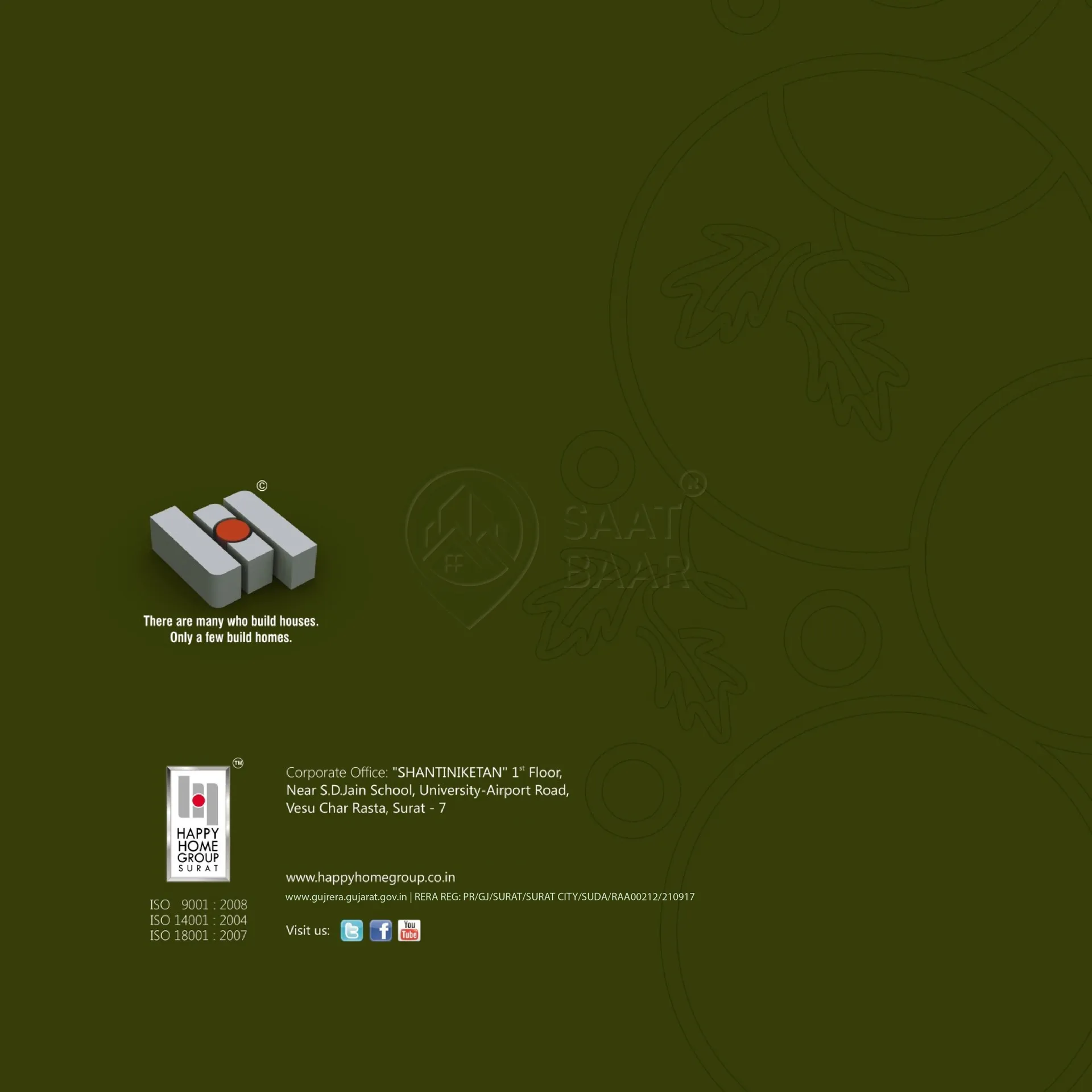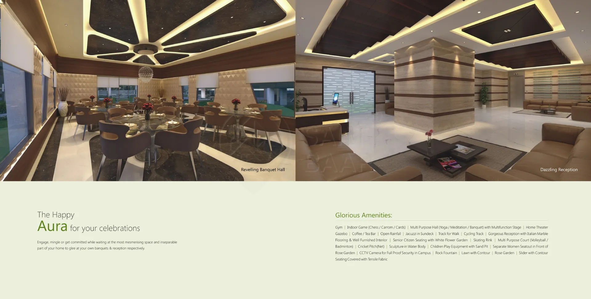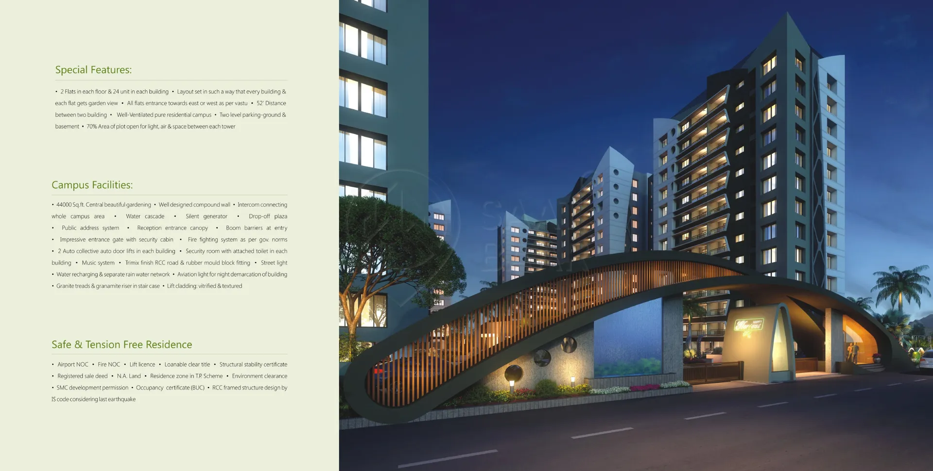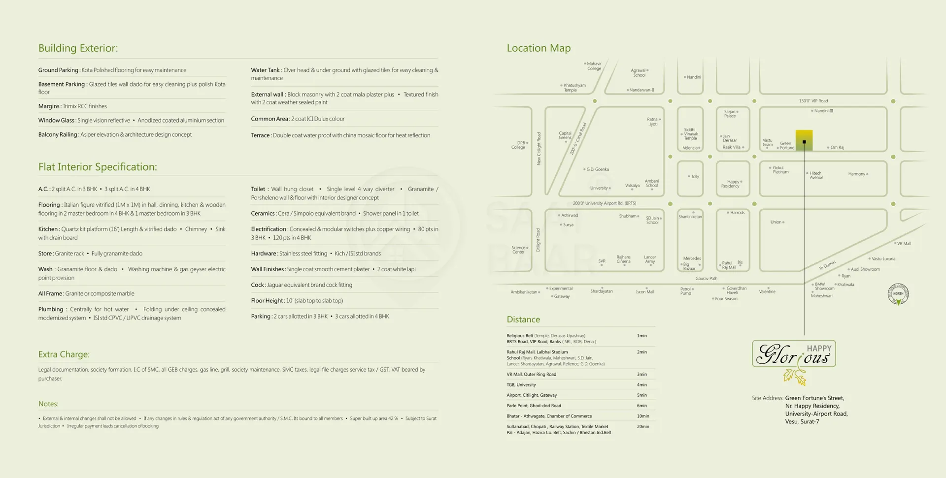Happy Glorious, located in the prime area of Vesu, Surat, offers luxurious 3 and 4 BHK flats ranging from 2255 to 2753 sq. ft. These spacious apartments come with premium interiors, including air conditioning, elegant flooring, modern kitchen designs, dedicated storage spaces, and stylishly designed bathrooms. The building boasts excellent exterior features such as ground and basement parking, a reliable water tank system, robust external walls, sleek balcony railings, and durable terrace construction. Large window panes with quality glass ensure ample natural light and ventilation. Designed for comfort and style, Happy Glorious is an ideal blend of modern living and practical amenities, offering an elevated lifestyle in Surat's most sought-after location.