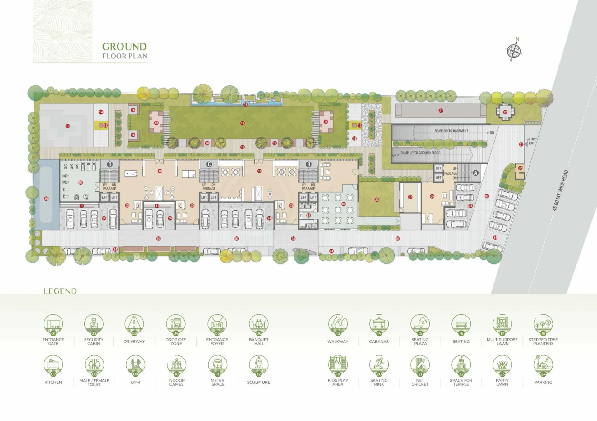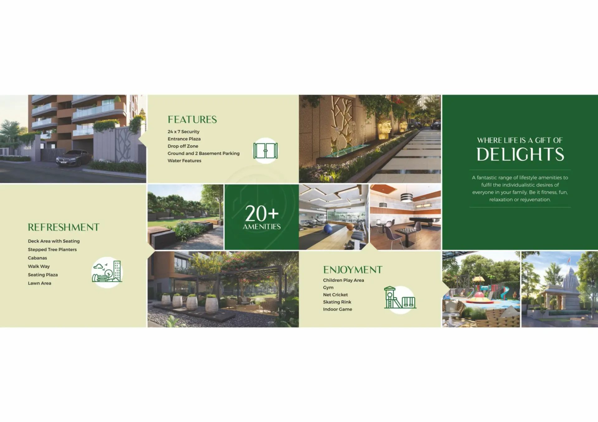 The amenities provided by Infinity Arbor are designed to cater to diverse interests and age groups. From a well-equipped gym and an indoor games room for fitness enthusiasts to a party lawn and gazebo for social gatherings, the project caters to a variety of lifestyle needs. Multi-use sports games, a multi-purpose hall, and a kids play area add to the recreational offerings, ensuring there's something for everyone. The landscape and lawn areas enhance the overall ambiance, creating a serene and visually appealing environment.