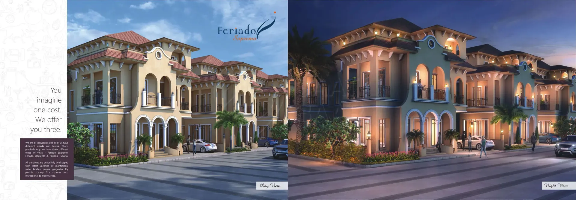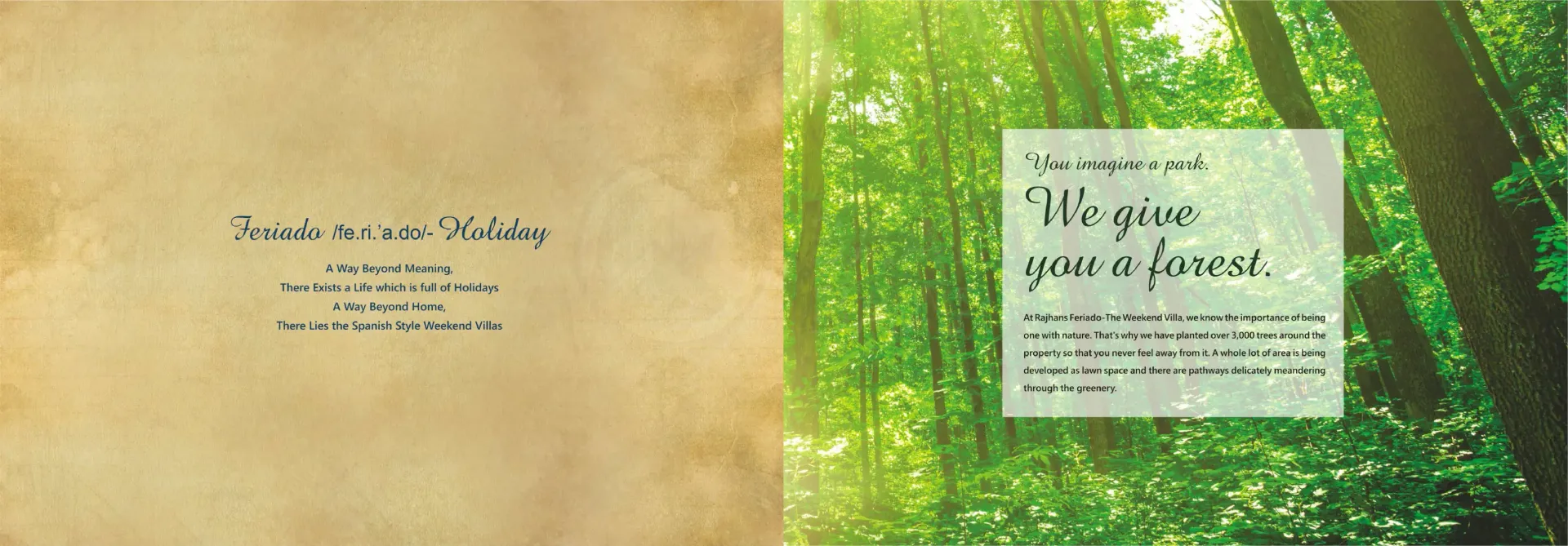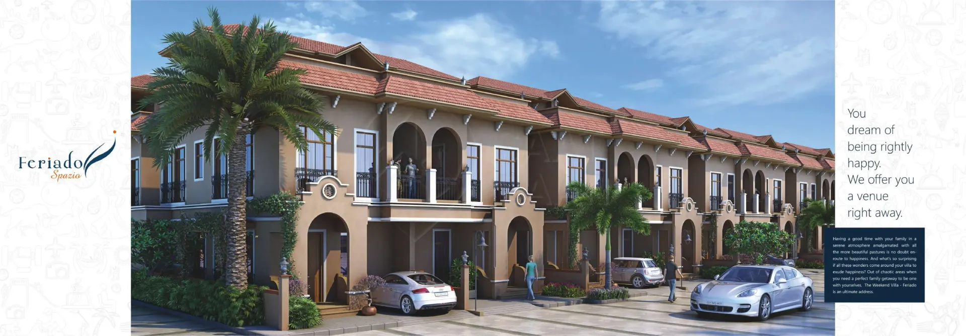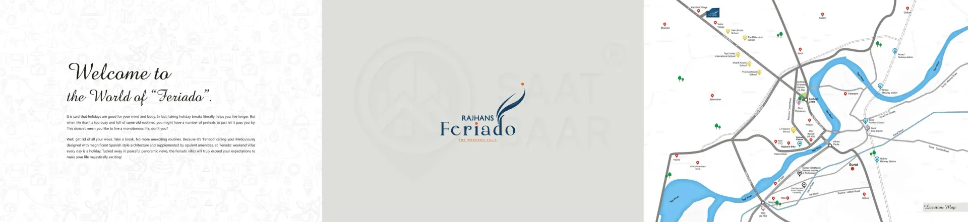 For all those who fancy an extravagant Spanish holiday, the dream comes true right in the prosperous land of Surat. Because it’s ‘Feriado’ calling you! Come, luxuriate in the elegance and essence of Spanish grace beyond your expectations. Magnificently-built with Spanish influence, the ‘Feriado’ Weekend Villas are nestled amidst serene surroundings of Kachhol, Dandi Road accompanied by the lush canopy of trees and green grasslands. These incredible weekend bliss ‘Rajhans Feriado’ brings you three types of villas - Opulento, Supremo and Spazio with awe-inspiring amenities that could even make the Spanish nobles envious. Come, revel in luxury and live a weekend life like never before. Extravagant Weekends. Extraordinary Life.