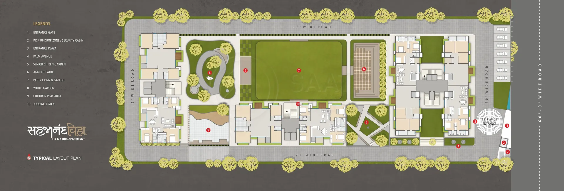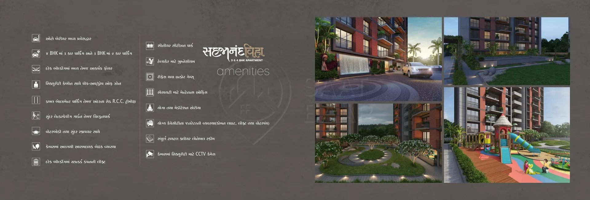 Residents of Sahajanand Viha are treated to a plethora of facilities designed to enhance their living experience. From the lush green landscape that provides a serene environment to the party lawn, perfect for hosting gatherings, every aspect of this project is meticulously crafted to cater to the needs and desires of its inhabitants. The inclusion of a Gazebo and pergola further adds to the charm and functionality of the community space.