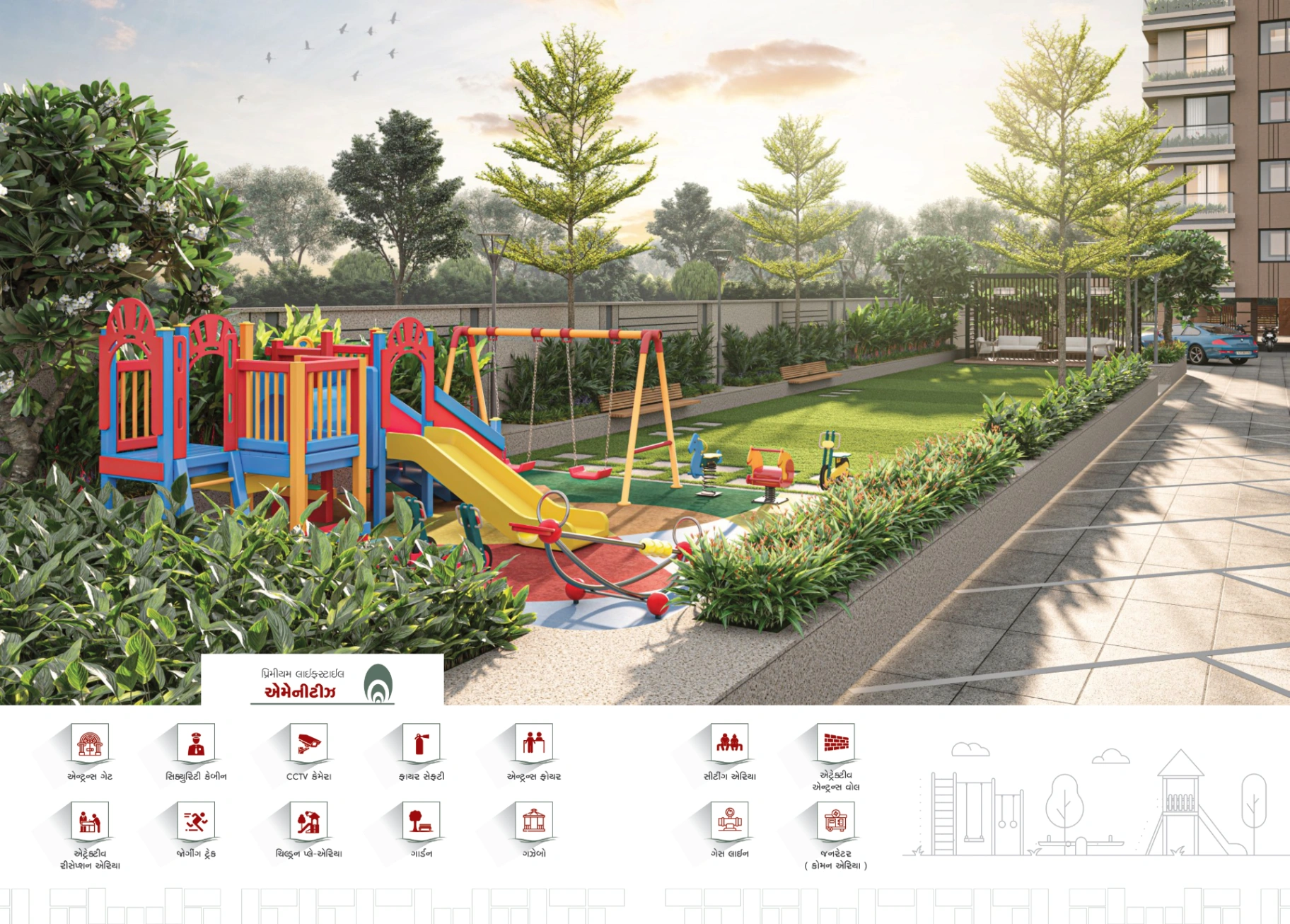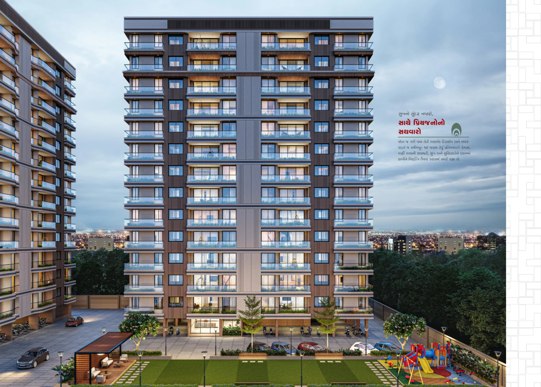 🚗 2 બેઝમેન્ટ પાર્કિંગ તથા દરેક ફ્લેટ માટે 2 કાર પાર્કિંગ એલોટેડ