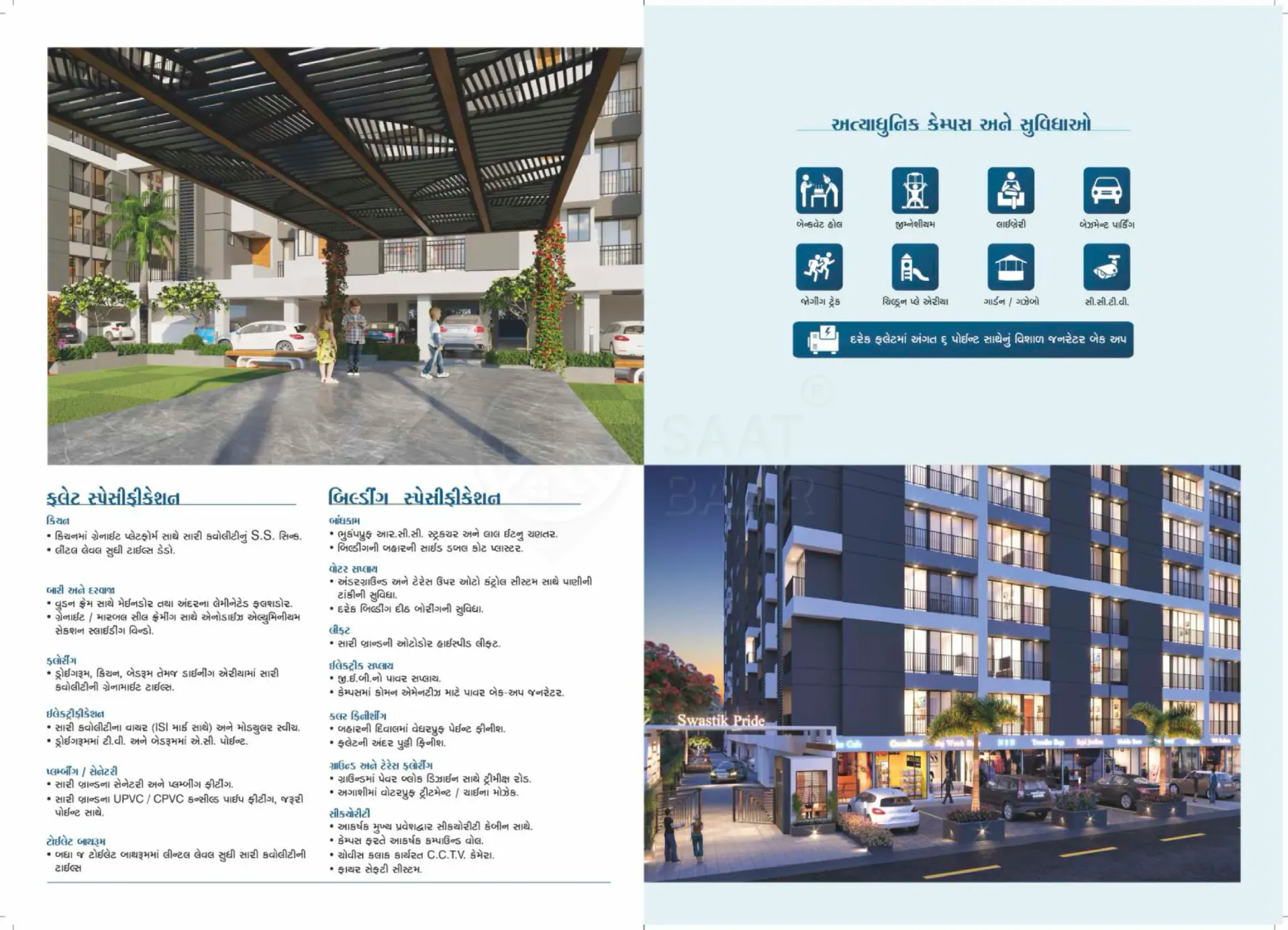 Swastik Pride, developed by Swastik Group, is a residential project located in Surat. Spread across 0.40 acres, it offers well-designed 2 BHK flats ideal for modern living. The project is equipped with a range of amenities, including a children’s play area, high-speed lifts, a secure entry and exit gate, and well-lit streets. It also ensures safety with fire safety systems and convenience with RCC roads and proper drainage lines. Swastik Pride combines thoughtful infrastructure with quality living, making it a desirable choice for families.