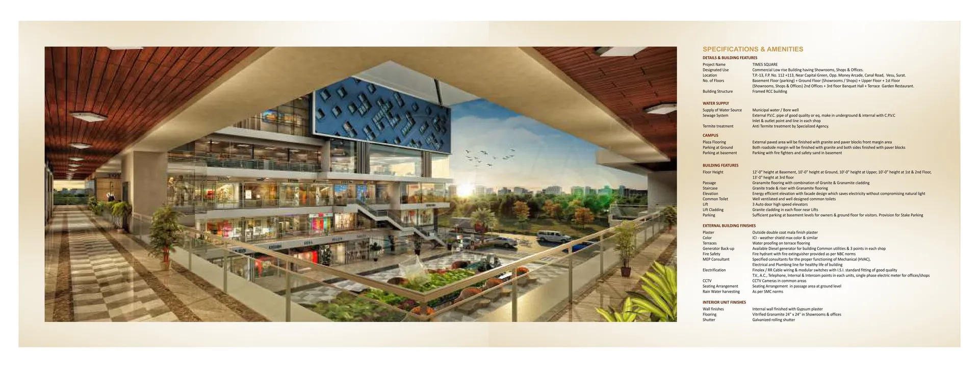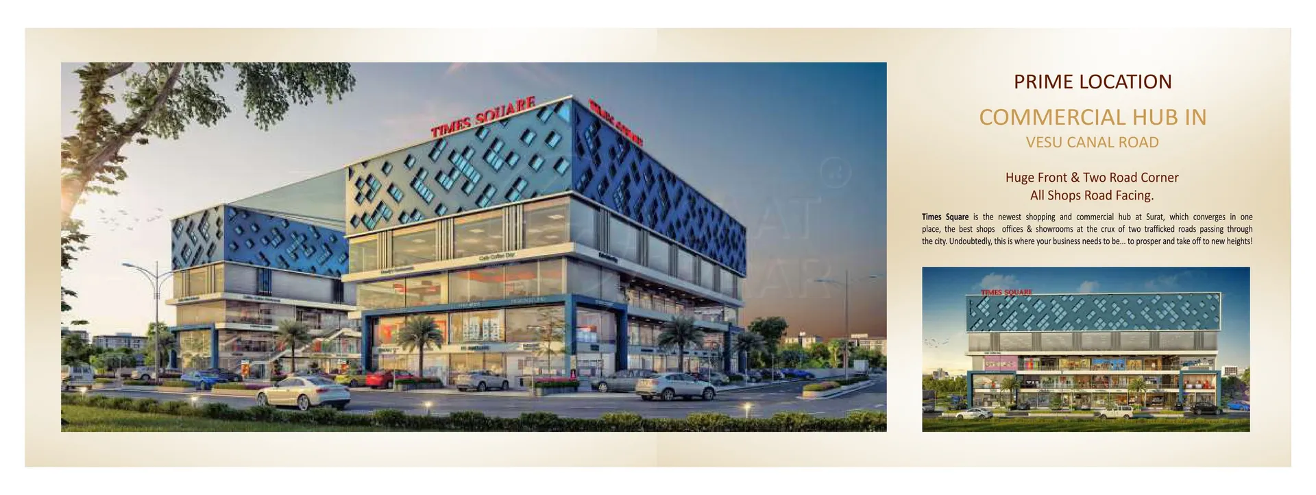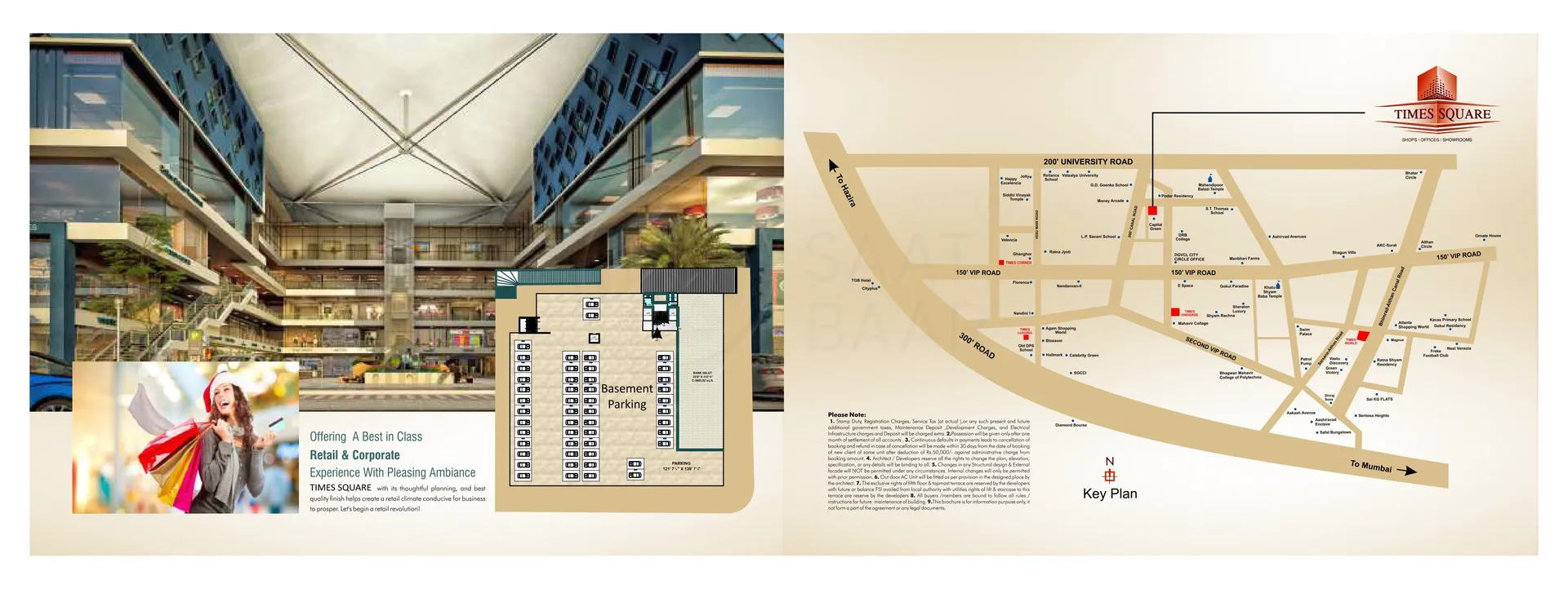 Times Square, located in Vesu, Surat, is a premium commercial complex spread across three hygienic and well-maintained floors. It houses a variety of premier shops, showrooms, and professional offices, including IT firms, corporate offices, CA offices, and banking facilities. The complex boasts modern amenities such as goods lifts, a grand entry gate, ample parking space, common toilets, and robust fire safety systems. Additional features include a gym for fitness enthusiasts, ensuring a perfect blend of business and convenience. Designed to meet the needs of professionals and shoppers alike, Times Square stands as a prime destination in Vesu.