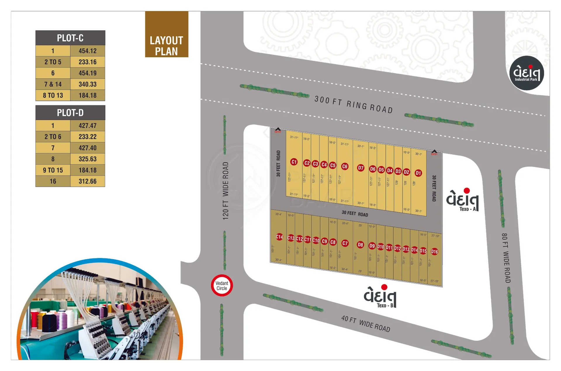 Vedant Texo-2, located in Kosad, Surat, is a thoughtfully designed industrial project featuring open plots divided into two parts, each measuring 340 sq. yards. Positioned strategically on the 300-feet Ring Road, it offers excellent connectivity and visibility. The project boasts modern amenities such as 30-ft wide internal RCC roads, efficient drainage systems, street lighting, and a secure main entry gate. With its prime location and well-planned infrastructure, Vedant Texo-2 is an ideal destination for businesses seeking growth and operational efficiency.