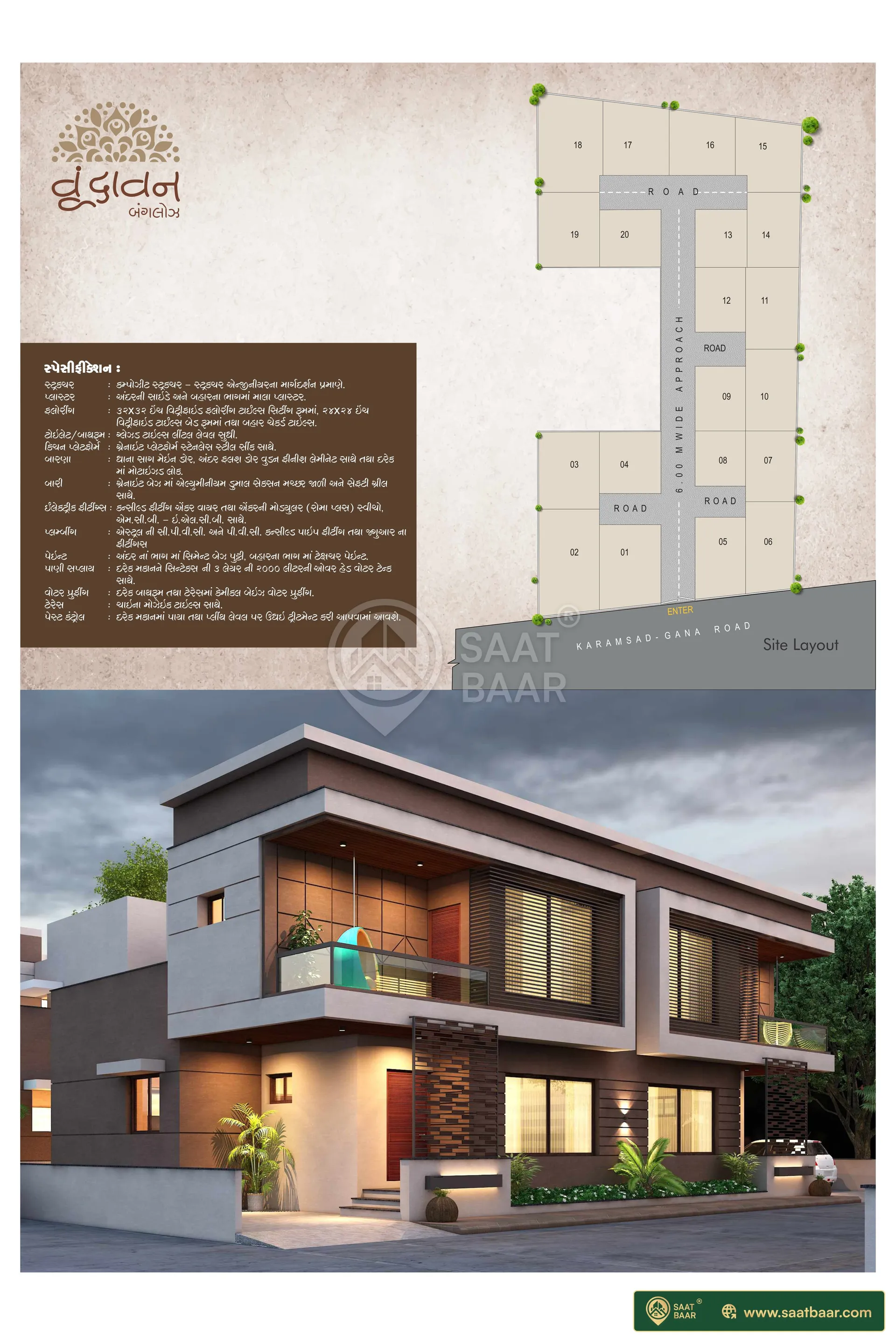 Welcome to Vrundavan Bunglows Villas, an abode of magnificent Villas in Anand with all modern features required for a contemporary lifestyle. These Residential Villas in Anand flaunts a resort like environment. It is now easy to experience how modern comforts blend seamlessly with magnificent ambience and how lifestyle amenities combine with refreshing green views. The reviews of Vrundavan Bunglows clearly indicates that this is one of the best Residential property in Anand. The floor plan of Vrundavan Bunglows enables the best utilization of the space. From stylish flooring to spacious balconies, standard kitchen size and high-quality fixtures, every little detail here gives it an attractive look. The Vrundavan Bunglows offers 3 BHK luxurious Villas in Karamsad. The master plan of Vrundavan Bunglows comprises of 20 meticulously planned Villas in Anand that collectively guarantee a hassle-free lifestyle. The price of Vrundavan Bunglows is suitable for the people looking for both luxurious and affordable Villas in Anand. So come own the ritzy lifestyle you’ve always dreamed of.