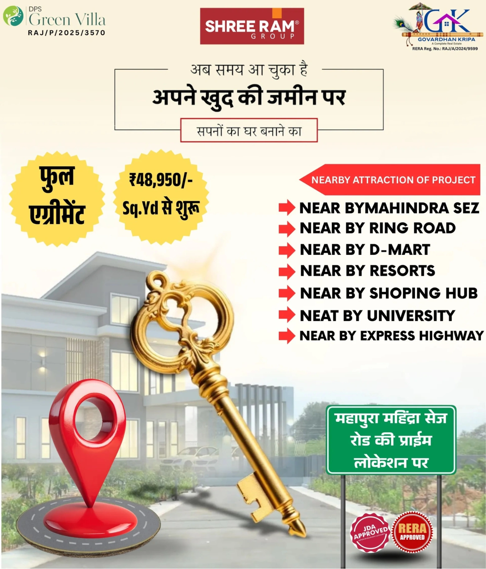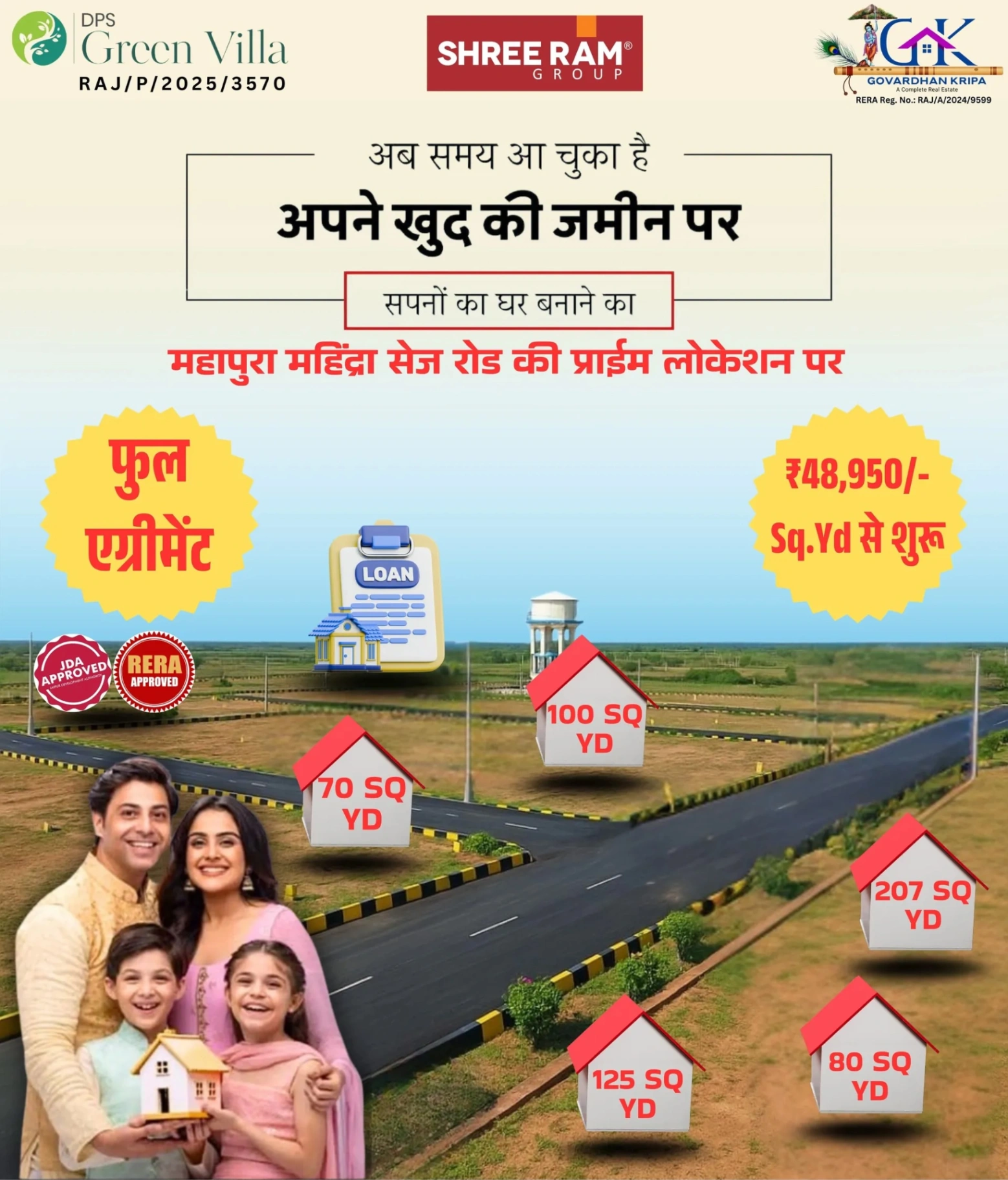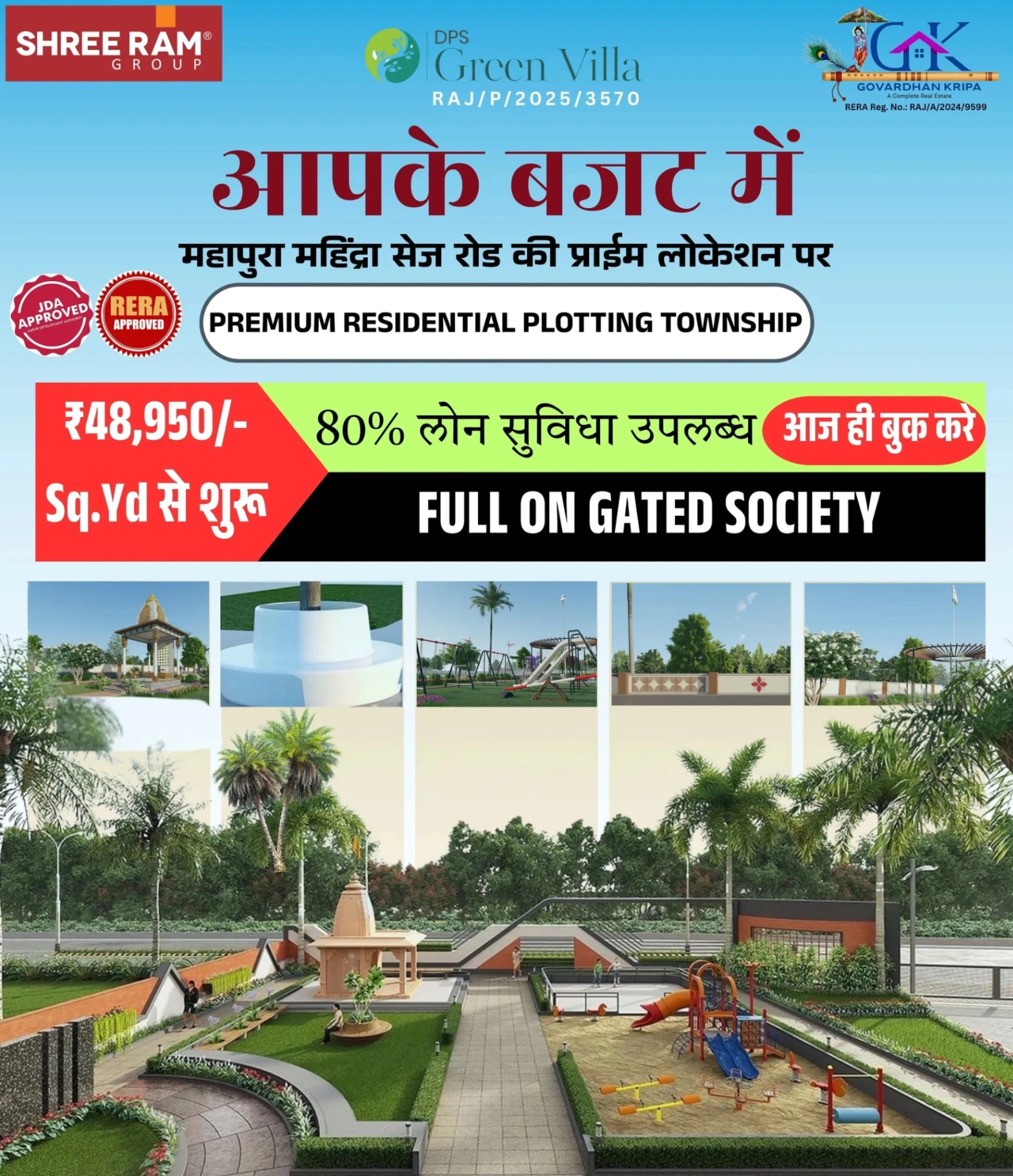 π‘ DPS Green Villa β Mahapura, Ajmer Road, Jaipur π‘ Luxury Plots β Perfect Location β Modern Facilities π Plot Size: 70 sq. yard se lekar 207 sq. yard tak β JDA & RERA Approved β Gated Township β Solar Road Lights β Water Borewell β Greenery & Plantation β Interlocking Tiles β Sewrage System β Peaceful Temple β Boundary Wall β¦aur bhi bahut kuch! π Prime Location Nearby: Mahapura Main Market Mahindra World City (SEZ) Ring Road, Pink Pearl, Kanchan Kesari Chokha Punjab, Gram Panchayat, D-Mart Geetanjali Medical Hub, Pasu Chikitsalaya DPS School, Decathlon, New Bus Stand 200 ft Metro Station, Petrol Pump Sanskrit University, Sarvodaya Govt. School πΏ Green Living ka mazaa, City Convenience ke saath! π Book Your Dream Plot Today with Vijay Govardhan Kripa Real Estate
